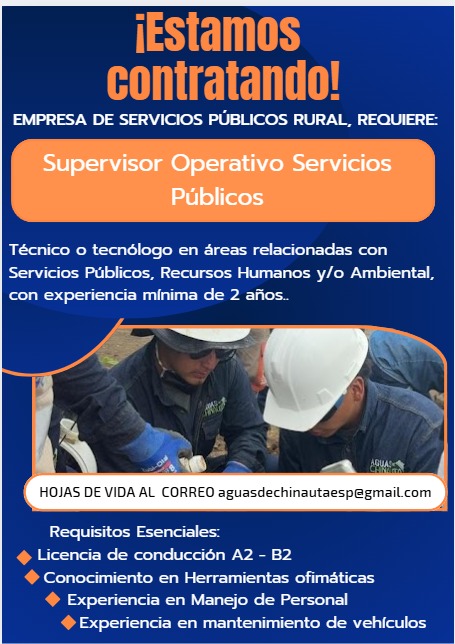 EMPRESA DE SERVICIOS PUBLICOS RURAL, REQUIERE: Supervisor Operativo Servicios Publicos Tecnico o tecnologo en areas relacionadas con Servicios Publicos, Recursos Humanos y/o Ambiental, con experiencia minima de 2 años.